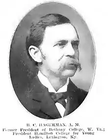 Barton Campbell Hagerman was from Shelby County, Kentucky and graduated from the Bible College of Kentucky University (now Transylvania University) in June 1874. He then attended Bethany College in West Virginia, graduating in 1876. He stayed there to teach Greek, and he married a Bethany College graduate Mamie Campbell on 11 September 1883.[2] They had two children while living in Bethany, one of whom lived to adulthood: Mary Virginia Hagerman Watson. After attending Hamilton College and then Campbell-Hagerman College, in December 1906, she married a distant relative Dr. Halford Adams Watson of Chicago - also a descendent of Thomas Campbell.[3]