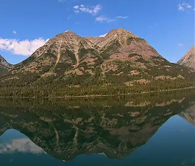 ![]() Olson Mountain (left) and Campbell Mountain (right) reflected in Waterton Lake | |