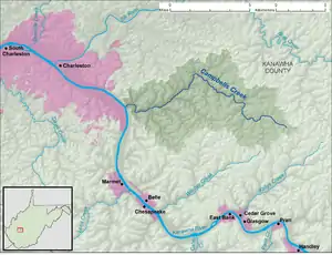 Campbells Creek is a tributary of the Kanawha River, 18.5 miles (29.8 km) long,[3] in West Virginia in the United States. Via the Kanawha and Ohio rivers, it is part of the watershed of the Mississippi River, draining an area of 39.3 square miles (102 km2)[4] on the unglaciated portion of the Allegheny Plateau, in the Charleston metropolitan area.