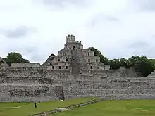 Much of Campeche's territory is filled with various archeological sites, almost all of which are Mayan. Maya sites in Campeche include Acanmul, Balamkú, Becán, Bolonchén, Calakmul, Chactún, Chicanná, Chunlimón, Edzná, Isla de Jaina, Lagunita, the Petén Basin, Río Bec, Isla Uaymil, Xculoc, Xpuhil, and Xtampak. These sites are less visited than sites to the east such as Chichen Itza, and Tulum.[10] An early important site is Edzna, located near the city of Campeche in a region known as los Chenes. It was one of the most important ceremonial centers in the pre-Classic Maya period (300-900 CE). Its building show Petén, Chenes and Puuc influence, with a large acropolis surrounded by various temples, the most important of which is the Pyramid of the Five Floors.[10][30] It was discovered in the 1920s and excavated in the 1940s. It is located away from other Mayan settlements on the peninsula and was probably a collection center for the agriculture products grown in the area, reaching its height between 600 and 900. These were sent to the city of Tikal in exchange for ritualistic adornment for the site. Its most important building is the Pyramid of the Five Stories, built as its name implies. Another important find came in the 1990s. During the planting season in early May, archeologist Antonio Benavides noticed that the setting sun illuminates a stucco mask hanging one of the pyramid's rooms. The effect also happens in August, during harvest and it is believed to be related to the asking and receiving of abundant crops.[10]