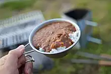 Some camping food is ready to eat and may be warmed using chemical heaters, such as the flameless heaters used in field rations or self-heating food packaging.[7]