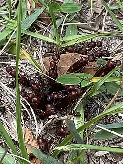 Camponotus socius or the Sandhill Carpenter ant is a large species of ant in the genus Camponotus.[1] It was first described by Roger (1863), based on specimens from Brazil - however these can be considered highly dubious as the location where the type specimens were collected (Amazonas) does not fit the known ecology of the species within North America, where it exhibits traits typical of a native species. It is well adapted to the sandy soils of xeric woodlands found within the coastal plains of the southeastern United States.[2][3][4] Its range includes the US states of Georgia, Alabama, Florida, North and South Carolina and Mississippi.