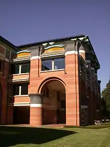 The university's first president, Edgar Odell Lovett, intended for the campus to have a uniform architecture style to improve its aesthetic appeal.[2] Influenced by the campuses of southern Europe, many of Rice's buildings are Mediterranean Revival in style,[2] with sand and pink-colored bricks, large archways and columns acting as architectural motifs. Noteworthy exceptions include the glass-walled Brochstein Pavilion,[7] Lovett College with its Brutalist-style concrete gratings, the eclectic-Mediterranean Duncan Hall, and the modern Moody Center for the Arts.