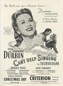 Can't Help Singing is a 1944 American musical Western film directed by Frank Ryan and starring Deanna Durbin, Robert Paige, and Akim Tamiroff.[2] Based on a story by John D. Klorer and Leo Townsend, the film is about a senator's daughter who follows her boyfriend West in the days of the California gold rush. Durbin's only Technicolor film, Can't Help Singing was produced by Felix Jackson and scored by Jerome Kern with lyrics by E. Y. Harburg.[3]