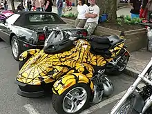 The Can-Am Spyder ("Spyder") is a three-wheeled motorcycle manufactured by Can-Am motorcycles, a division of Bombardier Recreational Products. The vehicle has a single rear drive wheel and two wheels in front for steering, similar in layout to a modern snowmobile. The Spyder uses an ATV-like chassis. The manufacturer refers to it as a "roadster," but in technical terms, it is more of what has been traditionally called a trike.