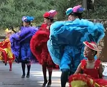 Can-Can dresses were historically worn during the can-can dance. Whilst the actual items of clothing can vary, but the general style of clothing remains the same. The main idea is that the dresses should be full of frills and ruffles and be multilayered. In one interpretation, designed for a play that was set in the 1890s, the cancan dresses were "in different colours with lots of ruffles and frills on their petticoats and pantalette style underwear... fishnet stockings with ruffled garters". The cancan outfit can also be adorned with some or all of the following accessories: ankle boots, hats, gloves, capes, shawls, wraps, boas, jewelry and feathers.[1] Traditionally, women commonly wore split knickers in their outfit.[2]