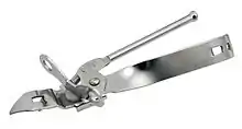 The first rotating wheel can opener was patented in July 1870 by William Lyman of Meriden, Connecticut, US and produced by the firm Baumgarten in the 1890s.[13] The can was to be pierced in its centre with the sharp metal rod of the opener. Then, the length of the lever had to be adjusted to fit the can size, and the lever fixed with the wingnut. The top of the can was cut by pressing the cutting wheel into the can near the edge and rotating it along the can's rim.[14]