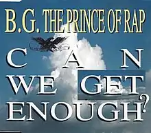 "Can We Get Enough?" is a song recorded by American German-based artist B.G., the Prince of Rap. It is one of his most successful songs and was released in 1993, as the first single from his second album, The Time Is Now (1994). Produced by German producer Jam El Mar, it peaked at number six in Italy, number 28 in Sweden and number 34 in Germany. On the Eurochart Hot 100, the song reached number 66 in August 1993. Outside Europe, it peaked at number 18 in Israel. A music video was also produced to promote the single.