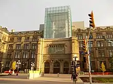 Materials used to erect the building include Tyndall stone, steel frames, reinforced concrete, stone exterior cladding, and sandstone.[14] Most of the sandstone used in the building was quarried from Nepean, Ontario, Wallace, Nova Scotia, and several communities in Quebec.[13] Granite used in the building was quarried from Stanstead, Quebec.[13]