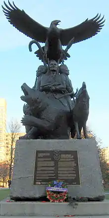 In the war, the great majority of First Nations supported the British, and many fought under the aegis of Tecumseh.[65] But Tecumseh died in battle in 1813 and the Indian coalition collapsed. The British had long wished to create a neutral Indian state in the American Old Northwest,[66] and made this demand as late as 1814 at the peace negotiations at Ghent. The Americans rejected the idea, the British dropped it, and Britain's Indian allies lost British support. In addition, the Indians were no longer able to gather furs in American territory. Abandoned by their powerful sponsor, Great Lakes-area natives ultimately assimilated into American society, migrated to the west or to Canada, or were relocated onto reservations in Michigan and Wisconsin.[67] Historians have unanimously agreed that the Indians were the major losers in the War of 1812.[68]