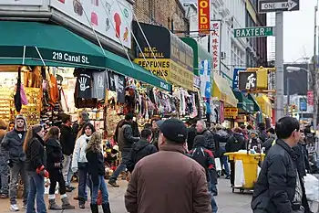 Canal Street is a bustling commercial district, crowded with comparatively low-rent open storefronts, and street vendors to the west; banks and jewelry shops to the east. For a generation after World War II, the former segment hosted many stores selling exotic high-tech components to would-be inventors and engineers.[7] Canal Street is also the main Chinese jewelry business district of Chinatown.[8] Tourists as well as locals pack its sidewalks every day to frequent the open-air stalls and bare-bones stores selling items such as perfume, purses, hardware, and industrial plastics at low prices. Many of these goods are grey market imports and many notoriously counterfeit, with fake trademarked brand names on electronics, clothing and personal accessories (including the fake Rolex watches that have become a Manhattan cliché). Bootleg CDs and DVDs were common, and were offered for sale on Canal Street—often before they were even officially released in stores or the theater—in makeshift stands and suitcases or simply laid out on bedsheets.[9]