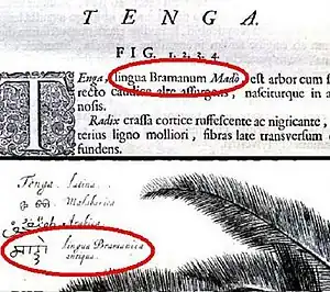 Though the book was the result of the indomitable will power of Hendrik Van Rheede, all the basic work and the original compilation of plant properties was done by three Konkani Physicians of Kochi, namely Ranga Bhat, Vināyaka Pandit and Appu Bhat.[14] The three have themselves certified this in their joint certificate in Konkani, which appears as such at the start of the first volume of the book.