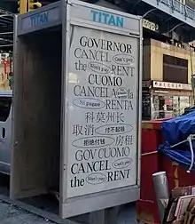Cancel rent is a slogan and tenant rights movement in the United States, which advocates for the cancellation of rental payments and suspension of mortgage payments during the coronavirus pandemic.[1][2][3][4] Activists and organizations have also presented other demands, which include the cancellation of housing-related expenses (such as utility payments), cancellation of late fees for housing payments, the establishment of a landlord hardship fund, an increase in emergency housing, and an eviction moratorium.[3][4][5] The movement was triggered by the economic impact of the pandemic, in which mass business closures and employee layoffs resulted in financial insecurity for many Americans. Tenants faced a range of issues, including the inability to pay rent, harassment or intimidation from landlords, and potential eviction. This situation put tenants at risk of damaged credit ratings, food insecurity, and homelessness.[1][6] Consequently, activists, tenants rights organizations, and some politicians have called for the cancellation of rent.[7][8][9]