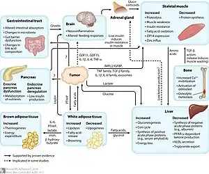 - Suzuki H, Asakawa A, Amitani H, Nakamura N, Inui A (May 2013). "Cancer cachexia--pathophysiology and management". Journal of Gastroenterology. 48 (5): 574–94. doi:10.1007/s00535-013-0787-0. PMC 3698426. PMID 23512346.