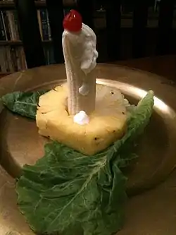 Candle salad is a vintage fruit salad that was popular in America from the 1920s through to the 1960s.[1] The salad is typically composed of lettuce, pineapple, banana, cherry, and either mayonnaise or, according to some recipes, cottage cheese. Whipped cream may also be used. The ingredients are assembled to resemble a lighted candle.