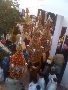 Moroccans parade carrying large, colorful candles, which they then place at the foot of the mausoleum Sidi Abdellah ben Hassoun.[3]
