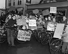 The strike began on the same day in Ladysmith, British Columbia, at the Wigwam Cafe, a confectionery store and luncheonette.[7][9][10] Shocked by the 60% price increase of the Wigwam's chocolate bars, of which there had been no advance notice, children organized a protest in front of the store, calling for a boycott of the bars, and adopting the slogan Don't be a sucker.[9] They staged their initial protest using a slogan-covered 1923 black McLaughlin Buick, which was followed by 40 protesting children.[9][10][11] As they marched, the children sang:[4][7]: 3