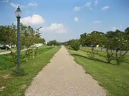 By 1998, the only part of the old Cane Belt system that still served rail shippers was south of Bay City. In that year, the Celanese Chemical and Lyondell Petrochemical companies shipped approximately 10,000 railcars through Bay City from their facilities.[18] In 2013, other short fragments of the original line existed as sidings at Eagle Lake and Thompsons.[19] A portion of the Cane Belt right-of-way that ran through Wharton has been converted into the 1.62 miles (2.61 km) Santa Fe Trail.[20]