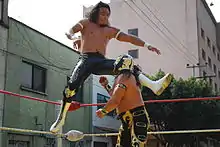 In May 2015 Casas competed in a qualifying match for the 2015 version of En Busca de un Ídolo as one of 16 wrestlers in the qualifying torneo cibernetico elimination match where the last eight wrestlers would qualify for the tournament. He competed against Akuma, Blue Panther Jr., Cancerbero, Delta, Disturbio, Esfinge, Flyer, El Gallo, Guerrero Maya Jr., Joker, Pegasso, Raziel, Sagrado, Stigma, and Boby Zavala.[10] Casas eliminated El Gallo and was among the eight wrestlers to qualify for the main portion of the tournament.[11][12] During the En Busca de un Ídolo the wrestlers would face off in a round-robin first round earning points based on the outcome. After the match each wrestler would receive critique and points from a four-man judging panel rating them on the match they just saw. Finally all wrestlers would be given additional points from a weekly online poll open to fans. During the first round Casas defeated Blue Panther Jr., Delta, Disturbio, wrestled to a draw against Boby Zavala and Flyer and lost to Esfinge and Guerrero Maya Jr.[13][14][15][16][17][18][19] His feedback from the judges was often critical of his skills, especially compared to his uncle Negro Casas and received between 22 and 30 points each week.[20][21] Casas never scored highly in the weekly polls, with the lowest score being 4 points and the highest being 16 out of 40 points.[22][23] Even before the final poll result for week 7 Canelo Casas was eliminated as he was at least 44 points out of fourth place.