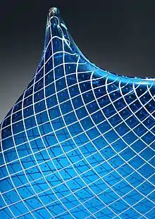 The classical reticello pattern is a small uniform mesh of white threads in clear glass, with a tiny air bubble in every mesh rectangle. To make an object in this pattern, the glassblower first uses white single-thread vetro a fili canes to blow a cylindrical cup shape, twisting as he forms it so the canes are in a spiral, and using care not to totally smooth the inside ribbing that remains from the canes. Setting this cup aside (usually keeping it warm in a furnace, below its softening point), he then makes another closed cylinder in the same pattern, but twisted in the opposite direction, and retaining some of the ribbing on the cylinder's outside. When this cylinder is the right size, the glassblower plunges it into the warm cup, without touching any of the sides until it is inserted all the way. Air is trapped in the spaces between the ribs of the two pieces, forming the uniformly spaced air bubbles. The piece may then be blown out and shaped as desired.[6]: 240 The term reticello is often loosely applied to any criss-cross pattern, whether vetro a fili or vetro a retorti , white or colored, and with or without air bubbles.