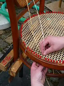 Furniture or chair caning may be confused with wicker; chair caning is specifically the craft of applying rattan cane or rattan peel to a piece of furniture such as the backs or seats of chairs, whereas wicker or wicker work is a reference to the craft of weaving any number of materials such as willow or rattan reeds as well as man-made paper based cords.
