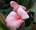 Canna 'Pringle Bay' is a miniature Italian and variegated group canna cultivar; variegated foliage, oval shaped, spreading habit; flowers are open, self-coloured pink, staminodes are large; fertile both ways, not true to type, not self-pollinating; rhizomes are thick, up to 3 cm in diameter, coloured pink and purple. Its main attraction is the bright variegated foliage, green, bronze and pink. Only about 40 cm in height.
