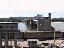 The Cannelton Locks and Dam is a tainter-gated dam with two locks on the Ohio River, on the border between the U.S. states of Indiana and Kentucky. The dam is 2 miles (3.2 km) southeast of Cannelton, Indiana. Construction of the locks began in July 1963. The locks began operation in December 1966 and were completed April 1967. Construction on the dam started in August 1965 and the dam was completed in 1974. The structure was designed, built, and is operated by the United States Army Corps of Engineers Louisville District.[1][2]