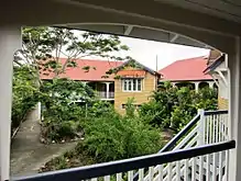 In 1954 the type was improved by replacing the proliferation of stumps in the understorey with a timber truss that spanned the width of the classroom and provided an unimpeded play space. This concept was further refined in 1957 by replacing the timber truss with a steel open-web joist that spanned further and removed more understorey stumps. This structural system was employed with reinforced concrete piers to support large loads at minimal cost.[41] This particular concept was applied in the 1959 construction of Block A, a two-storey brick and timber building (Type F/T7) stepped in section to link with Block B by a walkway. This structure was supported on concrete columns and steel open web joints with a cantilevered portion supporting the verandah. The understorey of Block A was left open for playing until the design was modified to add another classroom on the lower level.[17] The use of brick in the construction of Block A follows a structural scheme typical of 1950s school architecture.[42] It was partially constructed on land acquired in 1957 after the Department of Public Instruction purchased a property, to the west of the school on Wynnum Road, for future extensions to the school.[43][1]