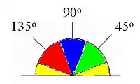 where G can be computed using the hypot function and atan2 is the arctangent function with two arguments. The edge direction angle is rounded to one of four angles representing vertical, horizontal, and the two diagonals (0°, 45°, 90°, and 135°). An edge direction falling in each color region will be set to a specific angle value, for instance, θ in [0°, 22.5°] or [157.5°, 180°] maps to 0°.