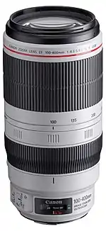 The EF 100–400 mm f/4.5–5.6L IS USM is a professional EF mount telephoto zoom lens manufactured by Canon Inc. The first version of this lens was announced in September 1998, and an updated version was announced in November 2014. It is a high performance telephoto lens most often used for sports and wildlife photography.