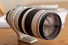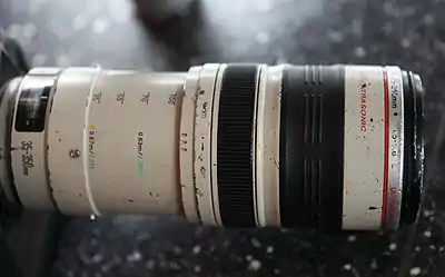 The lens contains 21 elements in 15 groups. As an L-series lens, it features two ultra-low dispersion (UD) elements, and utilizes Canon's ring USM for fast and silent focusing. It has a push-pull zoom design with the possibility to lock the lens at the desired focal length. The lens exhibits strong barrel distortion and chromatic aberration at the wide end. On an APS-C body, the lens shows almost no vignetting, even at its maximum aperture, f/5.6, at 350mm.[2]