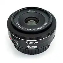 The EF40mm f/2.8 STM was a standard prime lens which was introduced by Canon in June 2012, alongside the EOS 650D/Kiss X6i/Rebel T4i.[1] The lens features a maximum aperture of f/2.8. It was Canon's first EF pancake lens. The EF 40mm was the first EF lens equipped with a stepping motor (STM). It was discontinued in March 2021.[2]