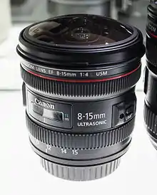 The EF8–15mm f/4L FISHEYE USM is a fisheye zoom lens for Canon digital single-lens reflex cameras (DSLRs) with an EF lens mount. It delivers 180° diagonal angle of view images for all EOS SLR cameras with imaging formats ranging from full-frame to APS-C, and provides 180° circular fisheye images for full-frame EOS models. Announced by Canon in 2010, it features UD glass for suppression of chromatic aberration and a subwavelength coating for reduced ghosting. It has full-time manual focus for instant switching from AF to Manual operation.