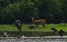 During the annual floods, deciduous forests are the only places where there is dry ground. They become the only feeding grounds available for bird species like the undulated tinamou, the bare-faced curassow, and the several species of wild pigeon that occur in Cantão. Many mammal species that don't do well on trees or in flooded areas also seek refuge in these forests, which consequently become prime hunting ground for the park's two large terrestrial predators, the jaguar and the puma.