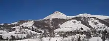 Cantal lies in the middle of France's central plateau.[5] The Cantal range is a group of extinct and eroded volcanic peaks. Its highest point is the Plomb du Cantal, which reaches an elevation of 1,858 meters (6,096 ft).[6] Its neighbors are Puy Mary (elev. 1,787 meters or 5,863 feet) and Puy Chavaroche (elev. 5,722 feet or 1,744 meters). To their north lie the Cézallier and Dore ranges and the arid Artense Plateau. Immediately to their east is the fertile Planèze Plateau, bound on its east by the Monts de la Margeride.[5]