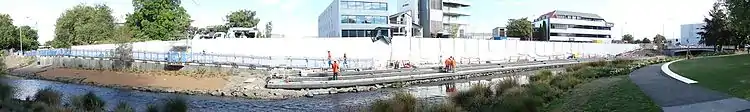 As part of the work, part of Oxford Terrace will be turned into a pedestrian precinct; prior to the earthquake, it was part of the central city's one-way system.[14] Construction of the memorial started with a groundbreaking ceremony by the Prime Minister – John Key, Earthquake Recovery Minister – Gerry Brownlee, Mayor of Christchurch – Lianne Dalziel, and Ngāi Tahu chairperson – Mark Solomon, on 12 November 2015.[15] During rain in May 2016, the construction site flooded and a spokesman stated: "It will flood occasionally and it is designed to cope with this."[16]