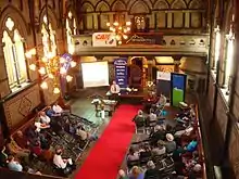 The foundation stone for the first building was laid in January 1858. The first set of buildings were a two-storey timber building, forming an L shape along the Durham Street frontage, with the Timber Chamber, modelled on 14th and 16th century English manorial halls, the meeting room for the Provincial Council. The Timber Chamber was behind the street frontage and was first used in September 1859. An extension to the north had already been commissioned at that time, which was opened in 1861. This extension was along Durham and Armagh Streets and, together with the existing buildings, formed a courtyard. The third and last set of buildings was constructed in 1864–1865. The Stone Chamber was the new meeting room for the council; it was larger than the Timber Chamber to cope with an increased size of the council. Its interior is described as provincial architect Benjamin Mountfort's most impressive achievement.[3] Bellamy's, the refreshment rooms, were added to the back of the Timber Chamber.[4][5]