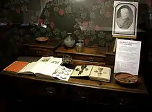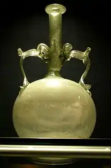 Excavated objects such as household deities, including one in the form of a horse, are shown here.[12] There is a lot of Roman glass including some decorated examples, silver spoons, an axe, tweezers, a plumb weight and dice. The 5th century AD silver hoard was excavated at Westgate Gardens in 1962.[13] Military artefacts include metal parts of cavalry harness which have been reconstructed with new leather straps and a pair of cavalry swords (spathae) recovered from a double burial, possibly a murder. Roof tiles and floor tiles are exhibited; one tile is impressed with the mark, "I, Cabrianus, made this tile". Another tile bears a dog's footprint, made while the clay was wet.[10]