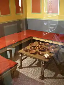 The museum contains a reconstructed Roman house with kitchen, and a Roman market place - probably situated in the forum - with cobbler, haberdasher, greengrocer and fast food seller. The cobbler exhibit is a consequence of archaeologists finding cut-out pieces of leather for sandals. The original cut-out leather pieces are exhibited along with reconstructions of the sandals being made. These sandals had reinforced soles. A computer screen demonstrates the possible appearance of the house in Roman Britain, with images of the pavement being excavated.[10][12] The time-tunnel display explains the end of the Roman occupation of the town, and the time-view painting displays Roman Canterbury as it was in later periods.[4][14][15]