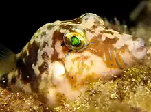 The Caribbean sharp-nose puffer is an omnivore. Much of its diet consists of spermatophytes and sponges. However, it is also known to consume seagrasses, algae, polychaete worms,[15] shrimps, crabs, gastropods, worms, soft coral, sea-stars, sea-cucumbers, and urchins.[16][17]