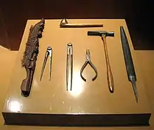 The batik making tools displayed at National Museum of Indonesia, Jakarta. From center top: tjanting a fine tool to apply wax; from left to right: wooden brush with coconut fibre hair, Iron calipers for measuring, also calipers, tongs, hammer, and file.