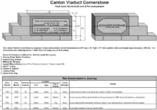 The majority of the viaduct is over land (71%), while 29% is over water. In addition to the six river portals, one roadway portal was originally provided. The distance between the transverse walls at this section is wider than all the other sections of the viaduct. The overall length is 615 feet (187 m) with a one degree horizontal curve that creates two concentric arcs. This makes the west wall slightly shorter than the east wall producing a slight keystone shape in the cavities. Originally unnamed, it was referred to as "the stone bridge" and "the viaduct at Canton" before it was eventually named after the town. The foundation stone was laid on Sunday, April 20, 1834, with a Masonic Builders' rites ceremony. Following to Masonic tradition, the foundation stone was located in the northeast corner of the structure.