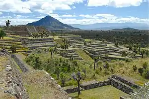 Its architecture is absent of stucco as decoration element, although mud was possibly used to join volcanic rock in addition to the technique of placing stone on stone, as was done to shape walls, alleys, platforms and other archaeological structures. There are two large prehispanic roads; these avenues are framed by high and thick volcanic stone walls, (some of them more than a kilometer long) that together with the streets and roads allowed access to the patios and ceremonial areas, constituting an important access control to the city and internal urban areas; this great fortress also had a moat that protected the city on its limits with the Valley, from possible invasions from this sector.[6]