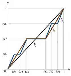 It is also called the Cantor ternary function, the Lebesgue function,[1] Lebesgue's singular function, the Cantor–Vitali function, the Devil's staircase,[2] the Cantor staircase function,[3] and the Cantor–Lebesgue function.[4] Georg Cantor (1884) introduced the Cantor function and mentioned that Scheeffer pointed out that it was a counterexample to an extension of the fundamental theorem of calculus claimed by Harnack. The Cantor function was discussed and popularized by Scheeffer (1884), Lebesgue (1904) and Vitali (1905).