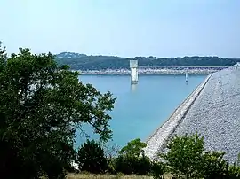 The dam is located near the Balcones Escarpment. The rocky canyons to the west of the escarpment can carry more water than the riverbeds of the plains to the east; this has caused problems with flash flooding in cities and towns east of the escarpment.