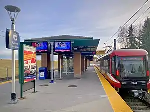 Canyon Meadows station is a CTrain light rail station in Canyon Meadows, Calgary, Alberta, Canada. It serves the South Line (Route 201) and opened on October 9, 2001, as part of the South LRT Extension Phase I. It is located on the exclusive LRT right of way (adjacent to the CPR ROW) 12.6 km South of the City Hall Interlocking, beside MacLeod Trail, to the north of Canyon Meadows Drive.