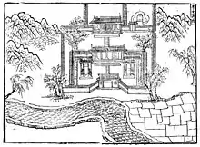 The Cao'e Temple (Chinese:曹娥庙) was built to honor Cao E, a young girl who was drowned when she tried to save her father in an act of filial piety. The temple was built for the first time in the year 151, and has been relocated, rebuild, restored and expanded several times. The last time this temple was rebuilt was in 1929 after a huge fire, the restoration lasted until 1936.[1][2]