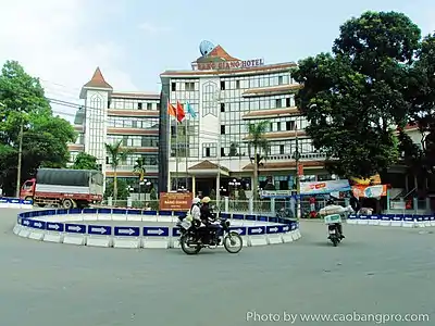 The Peninsular valley of Cao Bằng province is formed between the Bằng Giang and Hien rivers. The two rivers confluence to the northwest of the town. In the war with China the town was damaged in 1979 and has been since rebuilt. The market in Cao Bằng town is believed to be the largest in Vietnam.[9] Cao Bằng town is located on Highway 3 and is 270 kilometres (170 mi) from Hanoi. The road from Nao Pac to Cao Bằng passes through the Cao Bắc Pass. Since the elevation of the town is 300 metres (980 ft) it has a salubrious temperate climate throughout the year.[9]