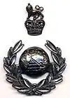 Cap badge of a Royal Navy warrant officer on a peaked cap.