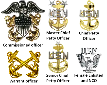The main exceptions to the Royal Navy pattern are the United States Navy and the United States Coast Guard, which once followed this pattern, but changed after the American Civil War to their current designs. The Navy has crossed anchors behind the eagle and shield for commissioned officers, while the Coast Guard uses a single large anchor held in the eagle's claws on its commissioned officers' caps. Chief petty officers and above in both the Navy and the Coast Guard have a larger version of their collar insignia as their cap badge for the combination cover and a miniature version worn on the garrison cap; petty officer first class and below in both services wear a full-sized rank insignia on the garrison cap. Junior enlisted costguardsmen wear a combination cap badge featuring a gold disc in front of two silver crossed anchors, while junior enlisted sailors do not wear the combination cap. Midshipmen at the US Naval Academy and Naval Reserve Officers Training Corps (NROTC) wear a single, upright fouled anchor on combination and garrison caps, while cadets at the US Coast Guard Academy wear a single fouled anchor surmounted by a five-pointed star, with one point facing down.